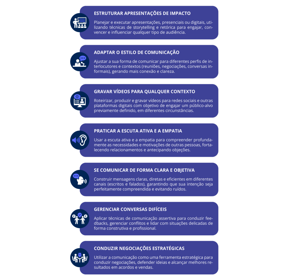 Neste programa, você vai descobrir, de forma prática e guiada, como aplicar as principais técnicas de comunicação em diversas frentes do seu dia a dia corporativo.
