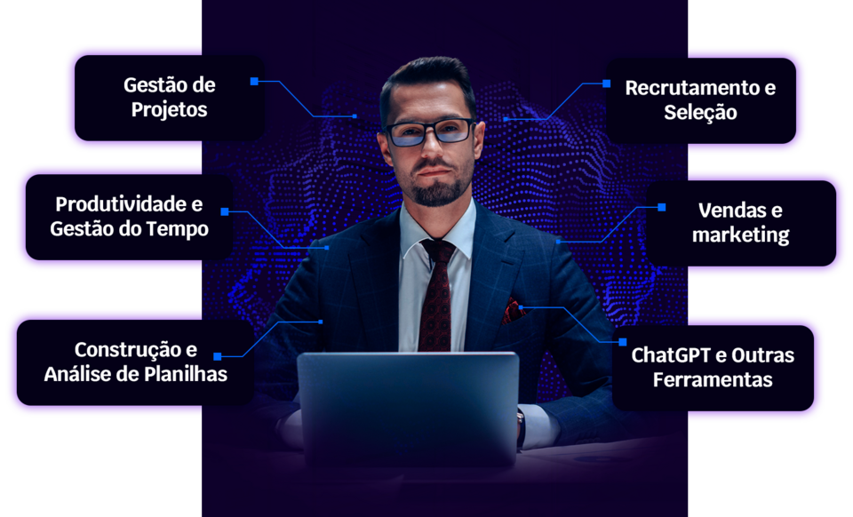 Nesse programa, você vai aprender o passo a passo de como aplicar A.I. em diferentes frentes de trabalho.